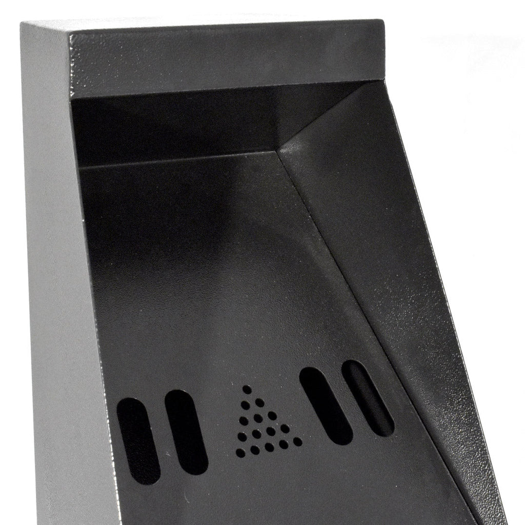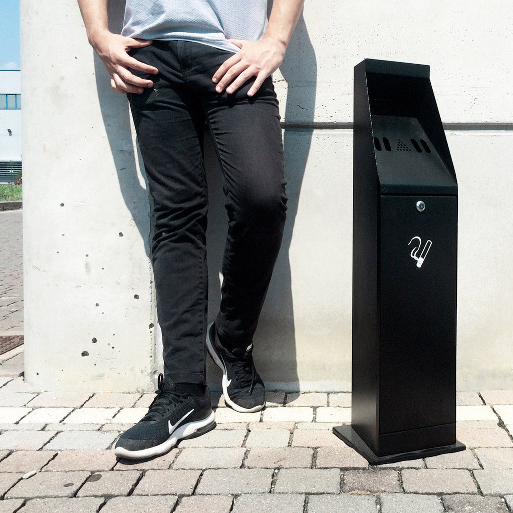 Posacenere a Colonna in metallo verniciato a polveri nero con struttura autoportante, ancorabile a terra e griglie superiori per spegnere le sigarette e fori per gettare i mozziconi. Dotato di apertura frontale con serratura e chiavi. Il Bidone interno rimovibile facilita lo svuotamento delle ceneri.