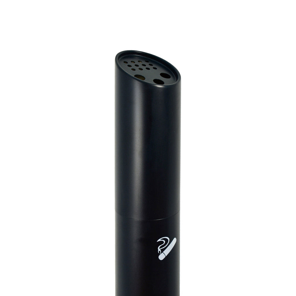 Posacenere a colonna per esterno realizzato in metallo verniciato a polveri nero opaco. Base circolare pesante ancorabile suolo in cemento con gommino perimetrale e copertura in metallo verniciato a polveri nero opaco. In dotazione tasselli di fissaggio e gommini copri fori per l'ancoraggio.