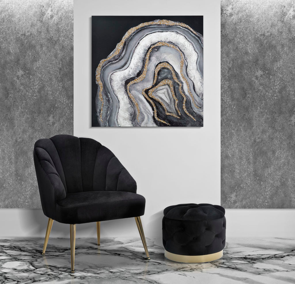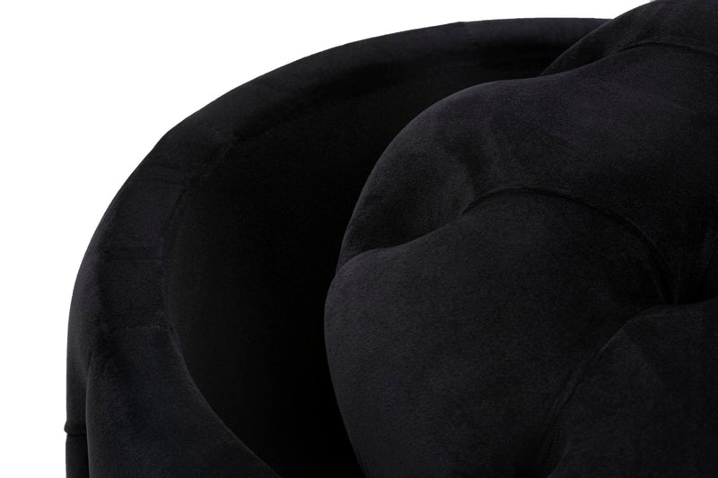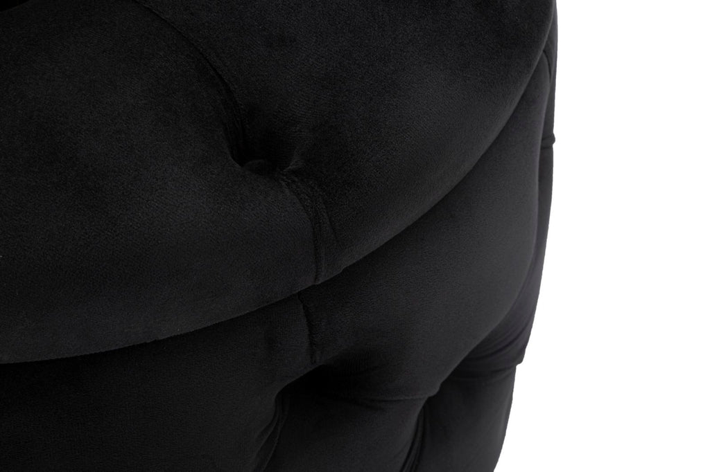 Puff rotondo in mdf e tessuto imbottito nero con decori dorati. Sontuosi poufs in velluto accoglieranno i tuoi ospiti trasportandoli in una magica atmosfera liberty anni '20.