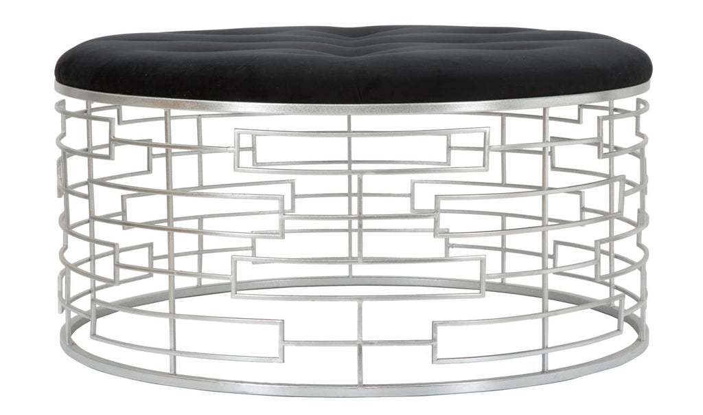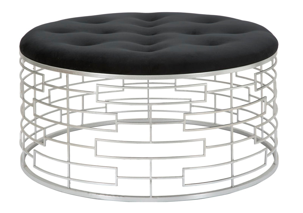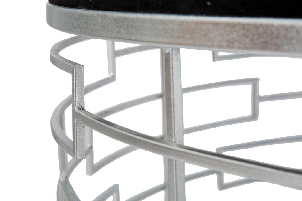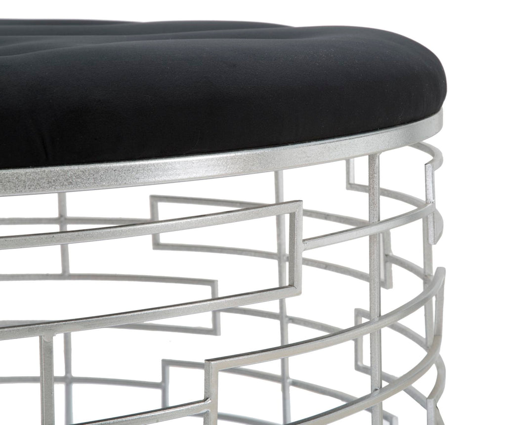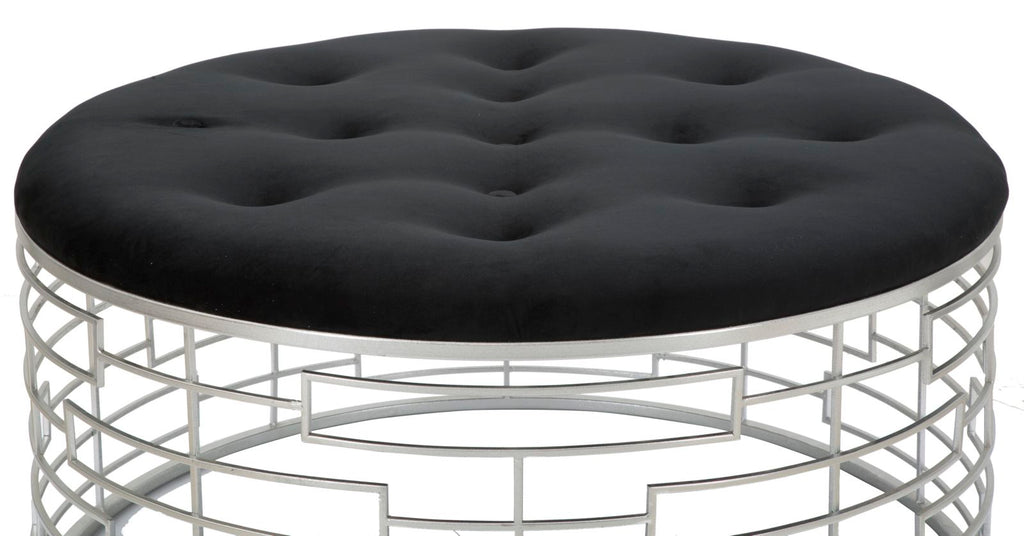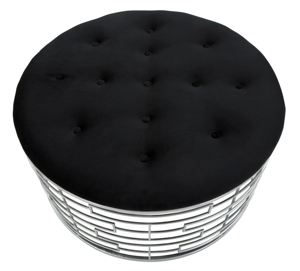 Pouff rotondo in metallo con velluto. Il nero e l'argento perfettamente accostati. Rettangoli abilmente collegati tra loro che danno la sensazione di piccoli igloo.