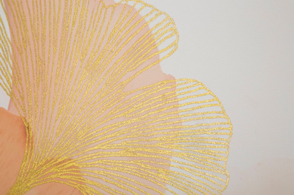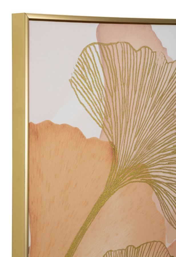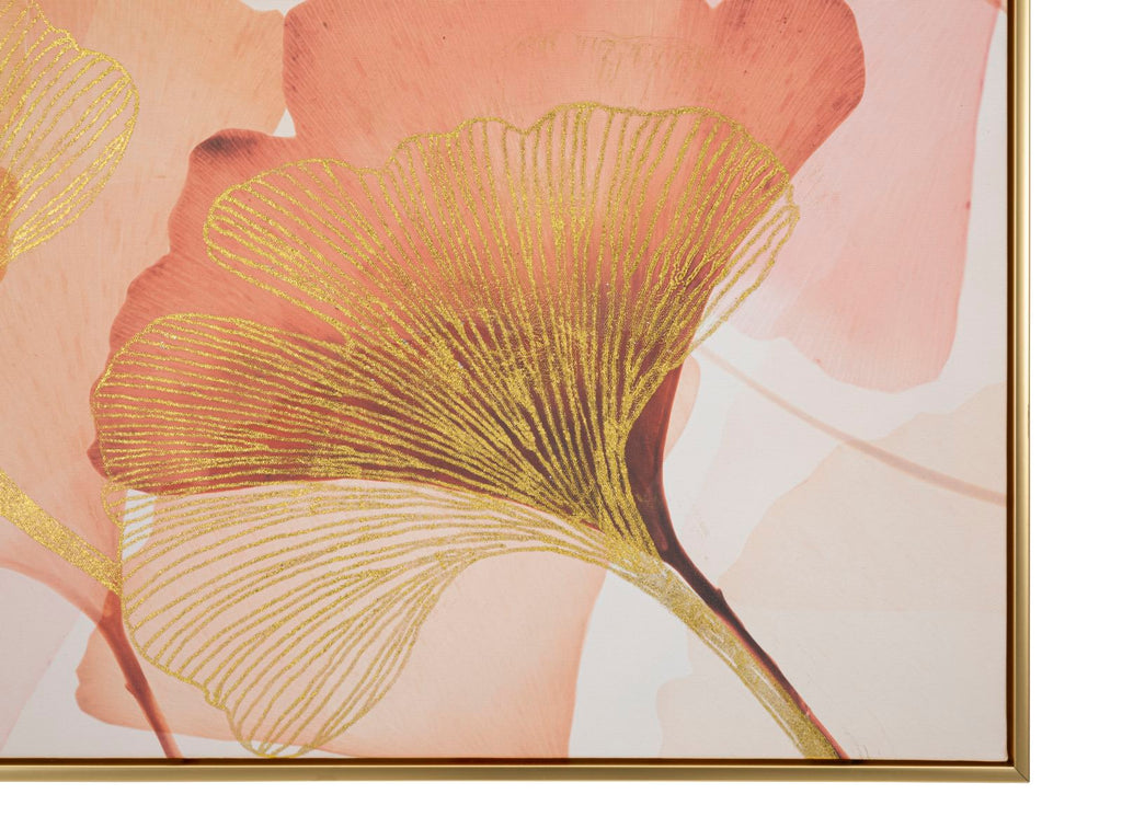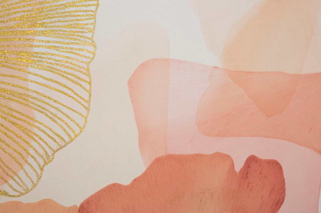 Stampa su tela completa di telaio ed elegante cornice dorata. Le decorazioni floreali insieme alle calde tonalità pastello donano un naturale tocco di relax.