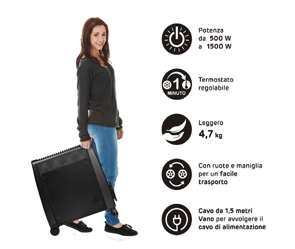 - Potenza Flessibile: Seleziona la potenza ideale tra 500 W, 1000 W e 1500 W per un comfort personalizzato e un consumo energetico ottimizzato.
