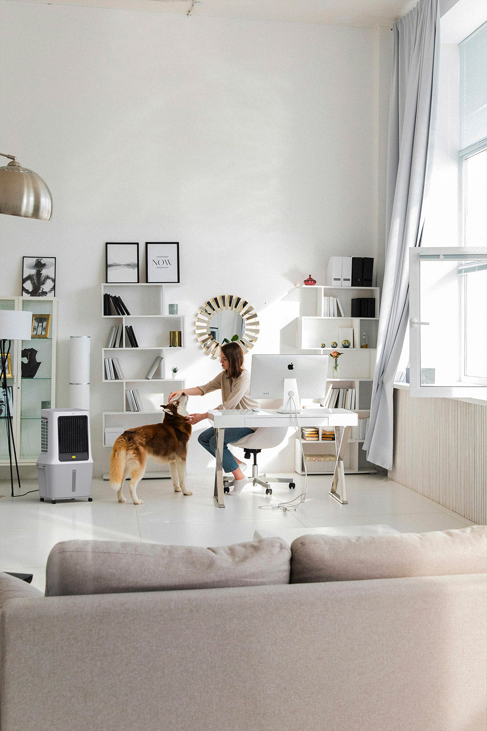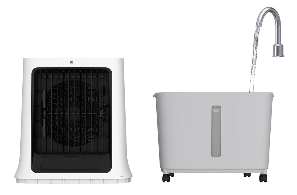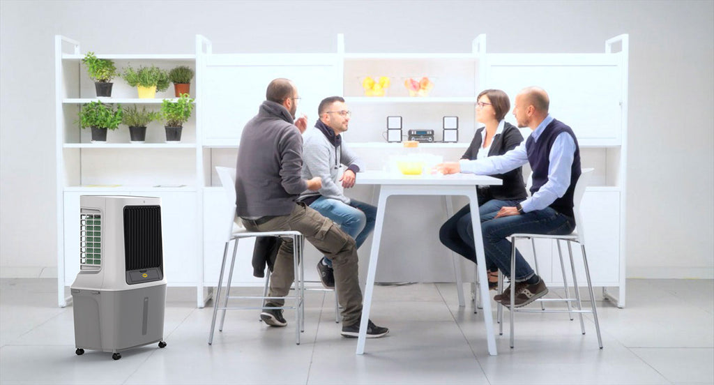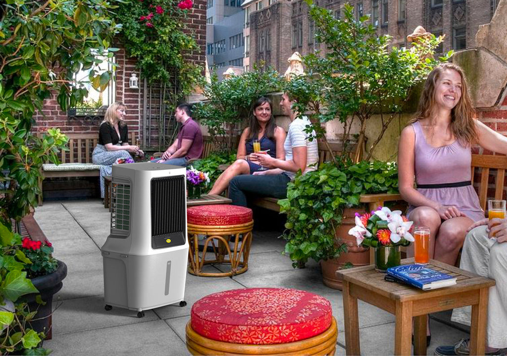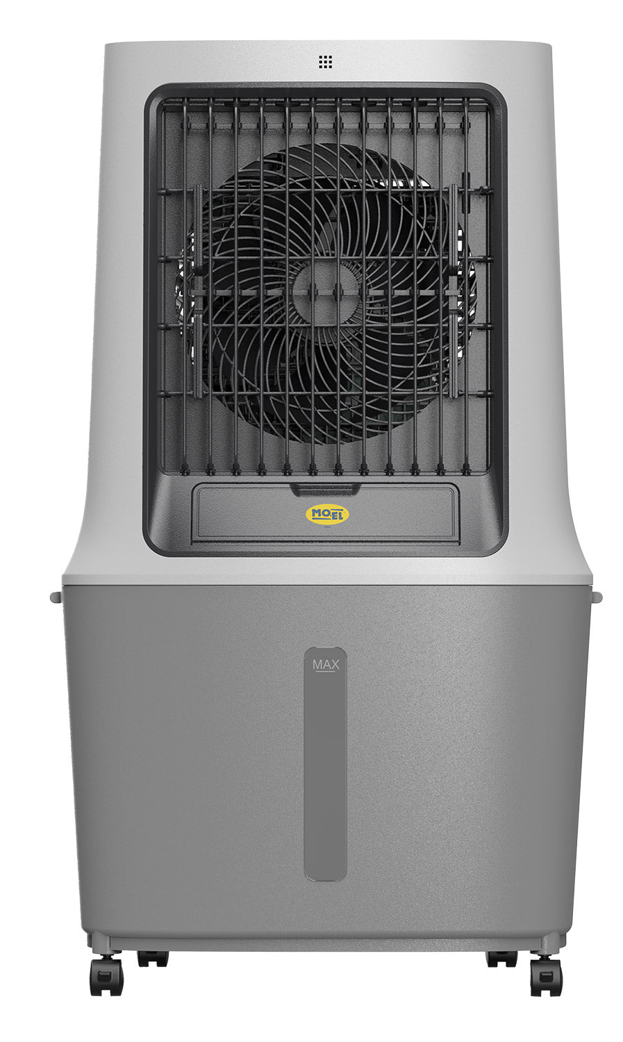 Raffrescatore a evaporazione ad alta potenza con funzione al plasma. L'aria calda passa attraverso la struttura a nido d'ape vaporizzando l'acqua e raffrescando in modo naturale. Bassissimi consumi (120W) senza utilizzo di compressore e di gas: funziona solo con acqua o ghiaccio (per un freddo più intenso) ed ha in dotazione 2 pacchetti di gel refrigerante. Portata d'aria di 2000 m3/h e serbatoio di 30 lt. Leggero e dotato di ruote, può essere utilizzato in qualsiasi ambiente, anche come semplice ventilatore. Dotato di timer, display digitale e telecomando.