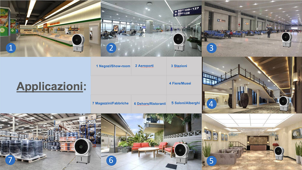 Bassi consumi (250W) senza utilizzo di compressore e di gas: funziona solo con acqua o ghiaccio (per un freddo più intenso). Portata d'aria di 6000 m3/h e serbatoio di 80 lt. 3 livelli di potenza. Leggero e dotato di ruote, può essere utilizzato anche come semplice ventilatore.
