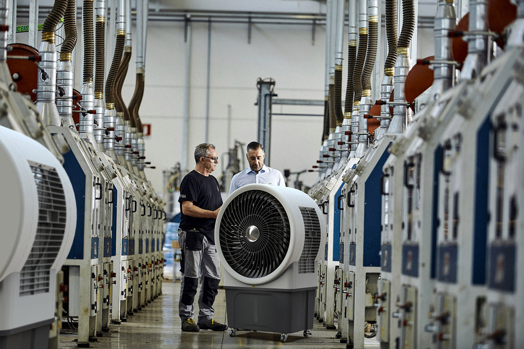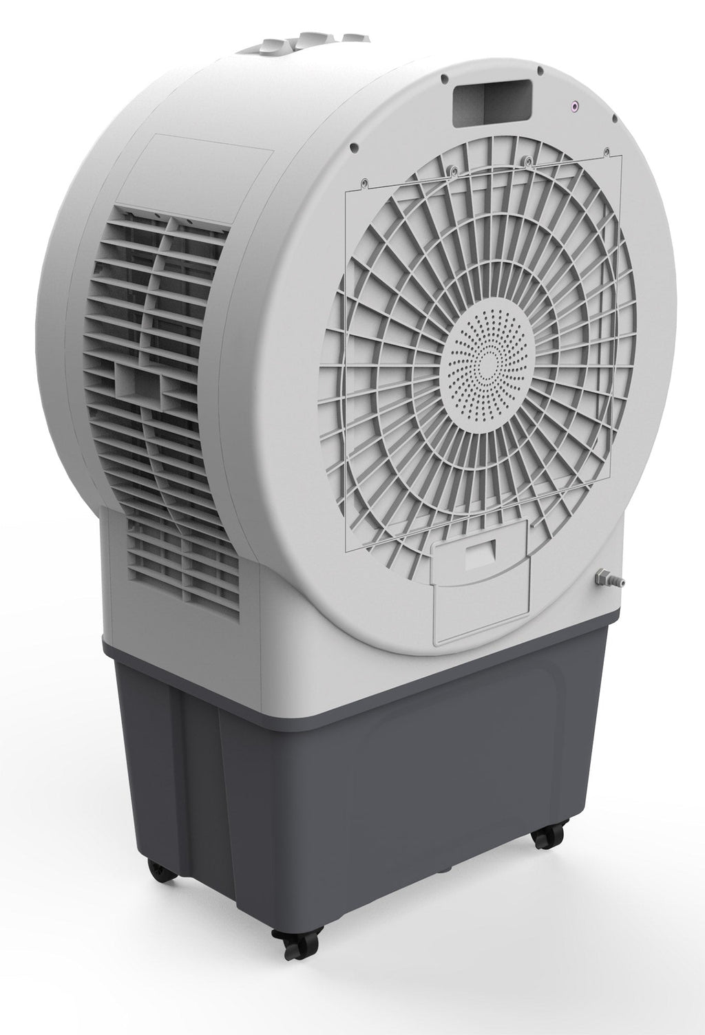 Raffrescatore a evaporazione ad altissima potenza per grandi ambienti. L'aria calda passa attraverso la struttura a nido d'ape vaporizzando l'acqua e raffrescando in modo naturale.