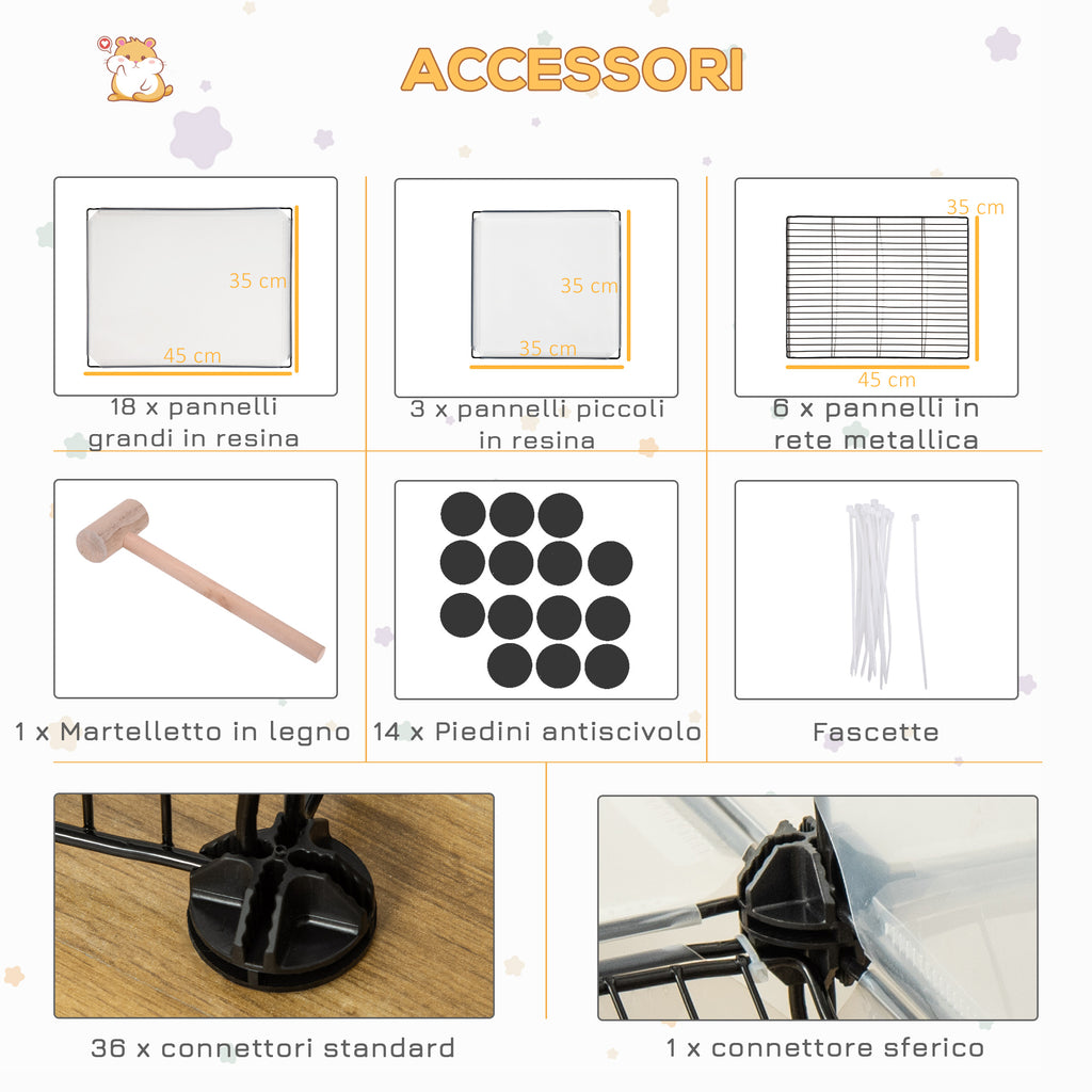 - ACCESSORI INCLUSI: Il recinto per animali è dotato di 6 pannelli in rete metallica, 21 pannelli in resina (18 grandi e 3 piccoli), 36 connettori standard e 1 connettore sferico. Include fascette e un martelletto in legno che puoi usare per installare il box senza nessuno sforzo.