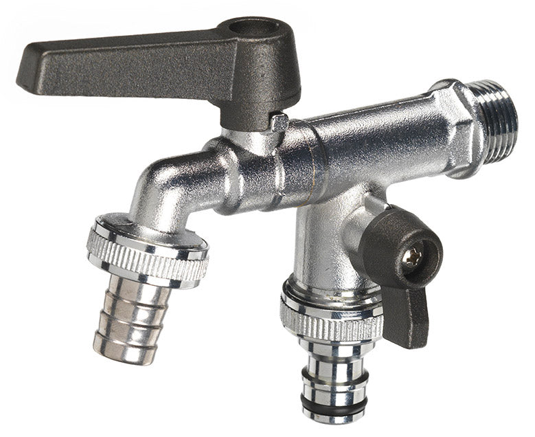 Rubinetto a sfera cromato a doppia uscita, uscita principale con attacco gomma tradizionale, uscita secondaria con attacco rapido. Leve verniciate.