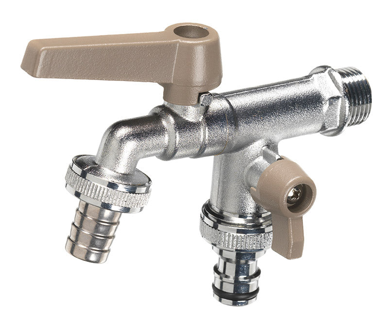 Rubinetto a sfera cromato a doppia uscita, uscita principale con attacco gomma tradizionale, uscita secondaria con attacco rapido. Leve verniciate.