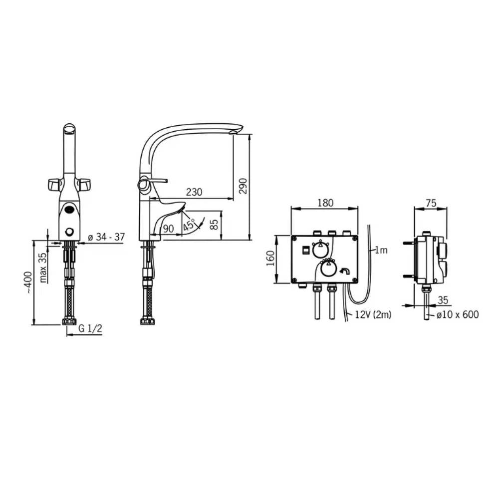 Il miscelatore da cucina Oras Ventura cromo 8020 è un rubinetto innovativo con funzione touchless. Dotato di leve di comando separate per acqua calda e fredda, offre un angolo di rotazione della bocca di 120° per una maggiore praticità. La posizione del beccuccio touchless può essere facilmente determinata durante l'installazione. La funzione touchless viene attivata semplicemente tenendo le mani all'interno del raggio di riconoscimento, mentre la temperatura dell'acqua può essere regolata tramite una centralina posta sotto il lavello. Inoltre, l'unità di controllo è dotata di un attacco per la lavastoviglie, offrendo opzioni di acqua calda e fredda. I valori preimpostati per l'intervallo di riconoscimento e il periodo di flusso sono regolabili in loco, e il collegamento elettrico avviene tramite un trasformatore a spina 230/12 V. Infine, i tubi di collegamento ø10 x 600 (2 pz) tra i tubi di ingresso e la centralina assicurano un corretto funzionamento del rubinetto, che è anche dotato di filtri lettiera e valvole di non ritorno.