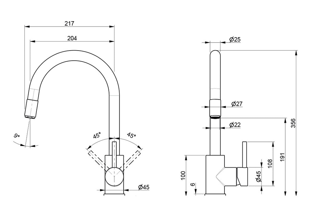 Miscelatore monocomando in acciaio inox per lavello, con canna tonda girevole nera, doccetta estraibile e flessibili di alimentazione F3/8". Declinazioni funzionali di design italiano dalle linee pure. Indicato per lavelli monofor.