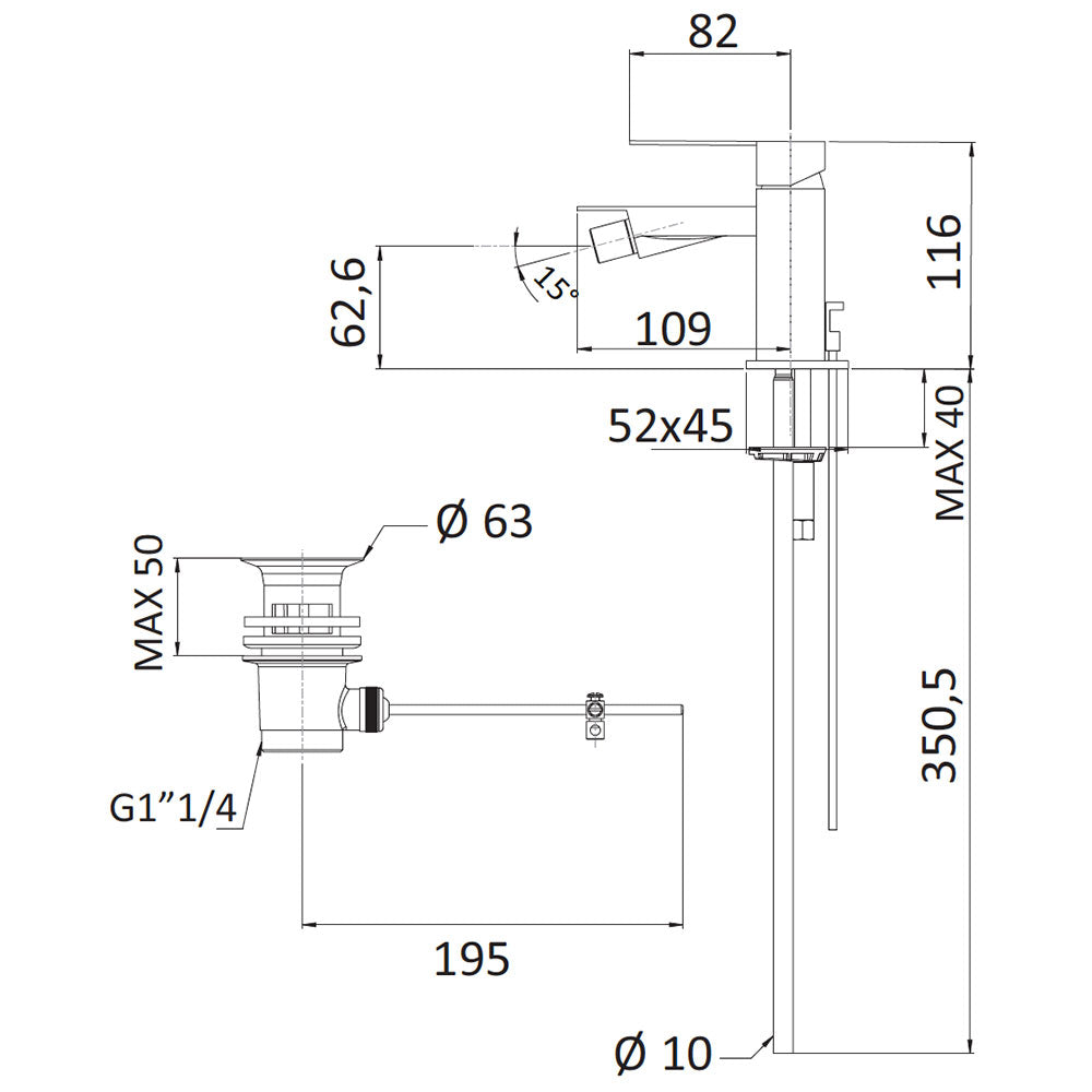 Miscelatore monocomando Bidet con scarico Mariani Polar 493/PA. Regolazione cartuccia a dischi ceramici ø 25 mm.