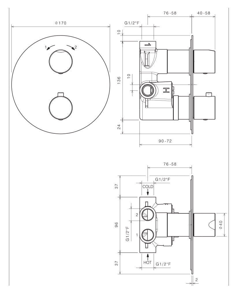 Miscelatore termostatico in acciaio inox a 2 uscite tondo per doccia da incasso, con maniglia di regolazione temperatura e maniglia erogazione con attacchi da 1/2". Risparmio idrico, design essenziale, visione tutta italiana. Indicato per docci.
