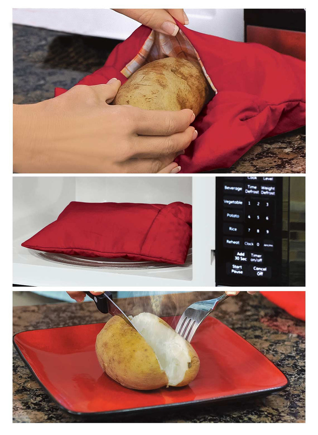 Il cuoci patate da microonde, è un sacchetto compatibile con il microonde che ha un interno isolante che cuoce rapidamente il contenuto, lavabile comodamente in lavatrice, ha una capacità di 4 patate grandi. Basta lavare le patate, senza spellarle. Posizionale nell'apposito sacchetto e poi mettere in microonde per soli 4 min. Dopodiché le patate sono pronte.