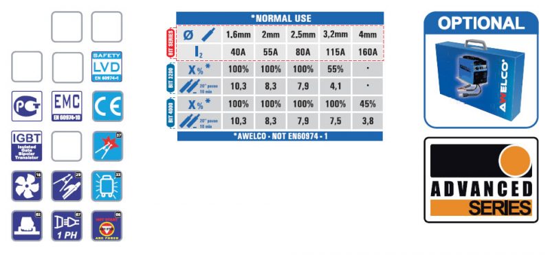La Saldatrice Bit 4000 della Awelco adatta per una saldatura ad elettrodo, comunemente chiamata MMA, fa uso di un generatore di corrente inverter che riproduce una corrente a basso voltaggio e molti ampere i quali sono usati per formare un arco voltaico, questo mediante il suo calore fa fondere il metallo dei pezzi da saldare ed il materiale di apporto costituito da un elettrodo rivestito. Per effettuare una saldatura perfetta, occorre impostare il giusto amperaggio, che varia a seconda del diametro dell'elettrodo e dello spessore da saldare. Leggero, compatto e affidabile. Con Valigetta.
