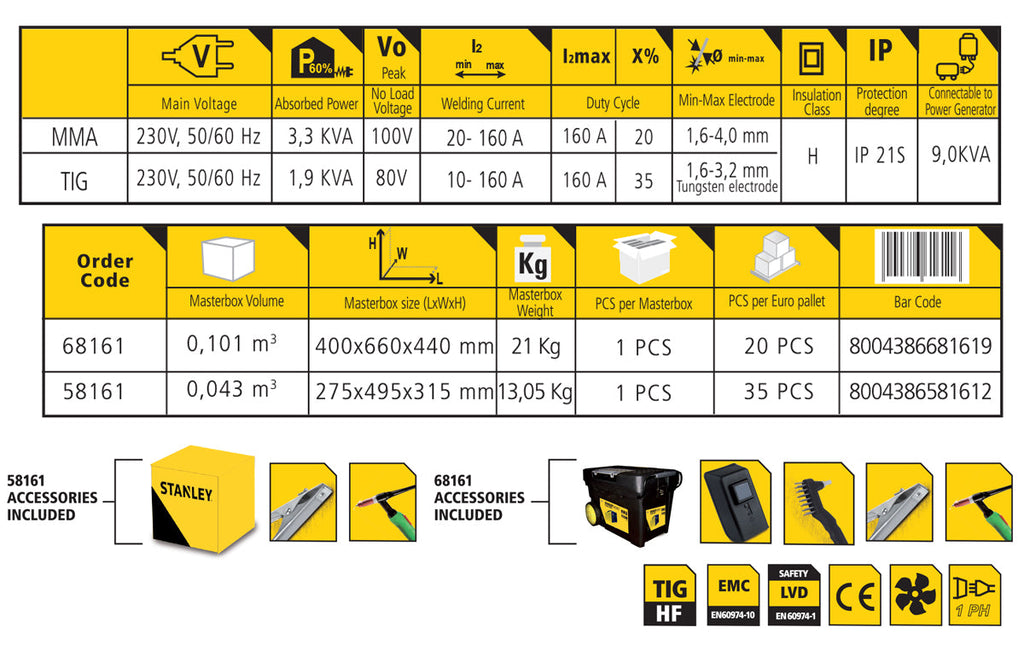 La Saldatrice Tig 161 I HF-DC della Stanley adatta per una saldatura a MMA e a TIG, fa uso di un generatore di corrente a inverter che riproduce una corrente a basso voltaggio e molti ampere i quali sono usati per formare un arco elettrico, questo mediante il suo calore fa fondere il metallo dei pezzi da saldare e lelettrodo al tungsteno non consumabile con o senza metallo di apporto. La saldatura a TIG avviene sotto protezione di un gas inerte. E utilissima per produrre saldature di elevata qualità su tutti i metalli e leghe. Dotata di torcia TIG, pinza massa, collegabile al generatore di corrente. Adatta per usi professionali e casalinghi.