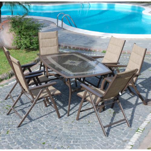 Salottino composto da 6 poltrone e tavolo con piano in vetro temperato, verniciatura a polvere epossidica resistente agli agenti atmosferici e alla ruggine.