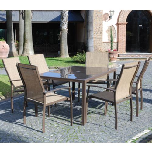 Salottino in ferro galvanizzato, composto da tavolo con piano in vetro temperato 5 mm, 6 poltrone, verniciatura a polvere epossidica resistente agli agenti atmosferici e alla ruggine e cuscini idrorepellenti in poliestere.