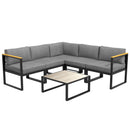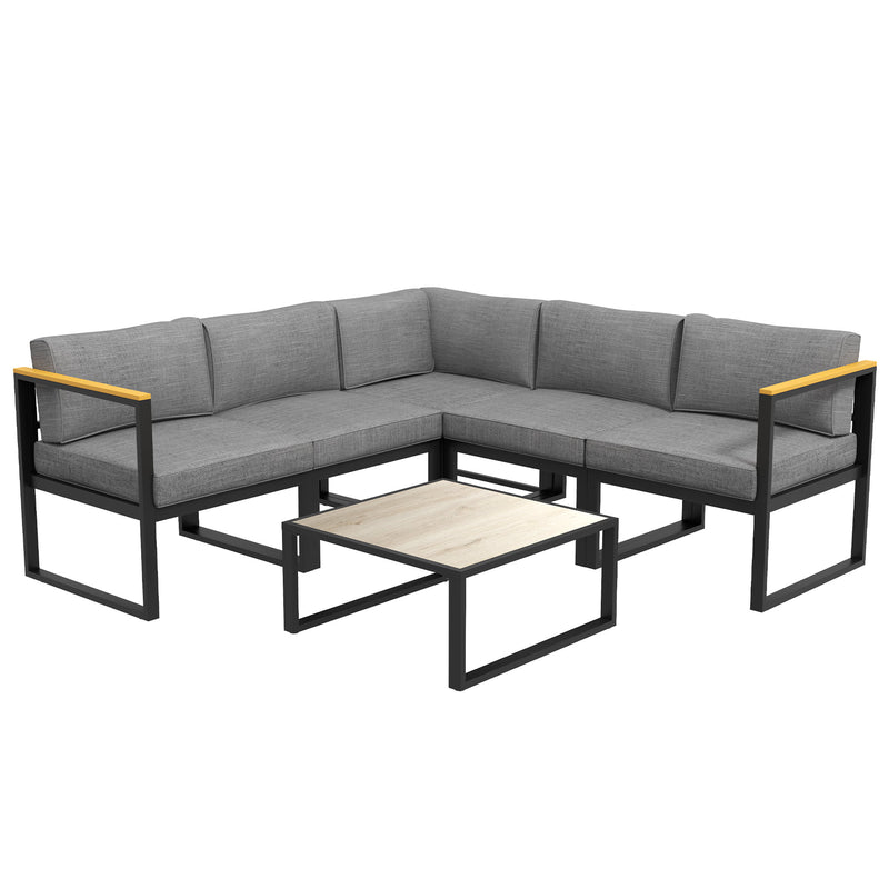 Porta comfort ed eleganza nei tuoi spazi esterni con questo salotto da giardino . Il set di mobili è composto da una divano angolare e un tavolino da caffè, e offre spazio per far accomodare fino a 5 persone. Seduta e schienale sono dotati di cuscini imbottiti e sfoderabili, per offrirti il massimo comfort nei momenti di relax. Vivi al meglio il tuo spazio all'aperto con i nostri mobili da giardino.