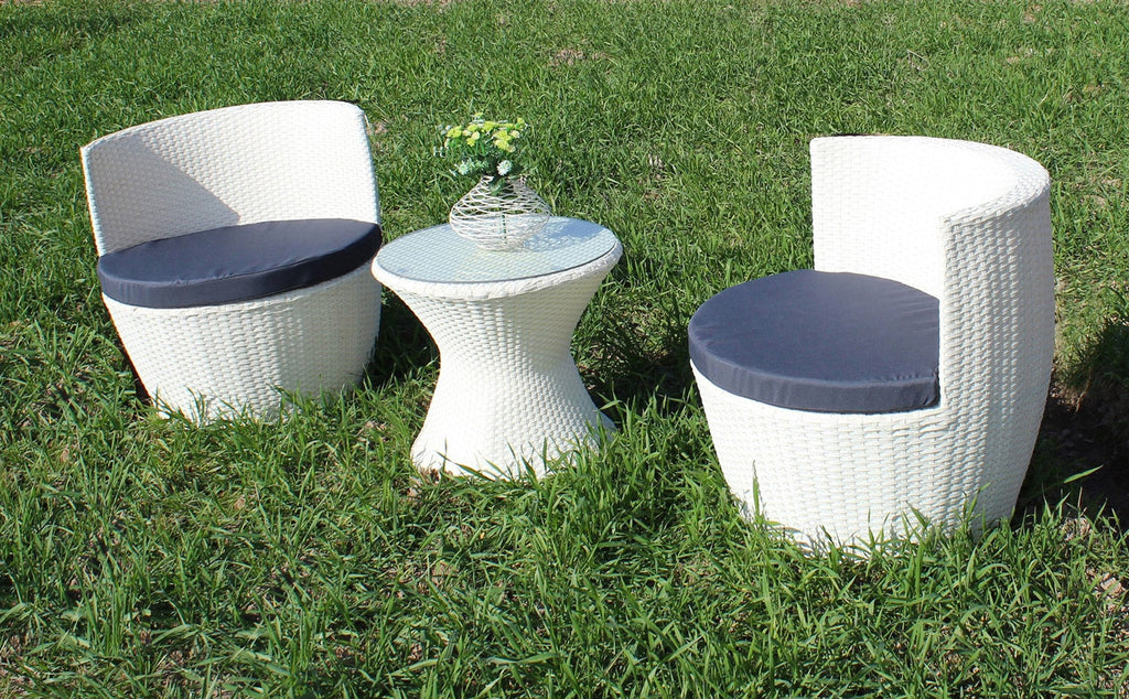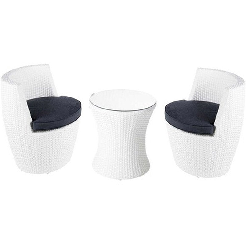 Salottino impilabile in polirattan composto da due poltrone, tavolino con vetro e cuscini.