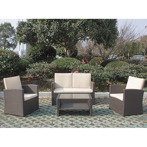 Salotto in polirattan composto da divano 2 posti, due poltrone, tavolino con vetro temperato e cuscini.