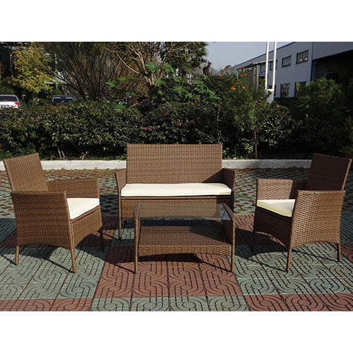 Salotto in polirattan composto da divano 2 posti, due poltrone, tavolino con vetro temperato e cuscini.