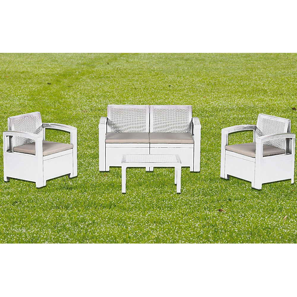 Salotto in resina antiurto composto da divano 2 posti, due poltrone, tavolino e cuscini.