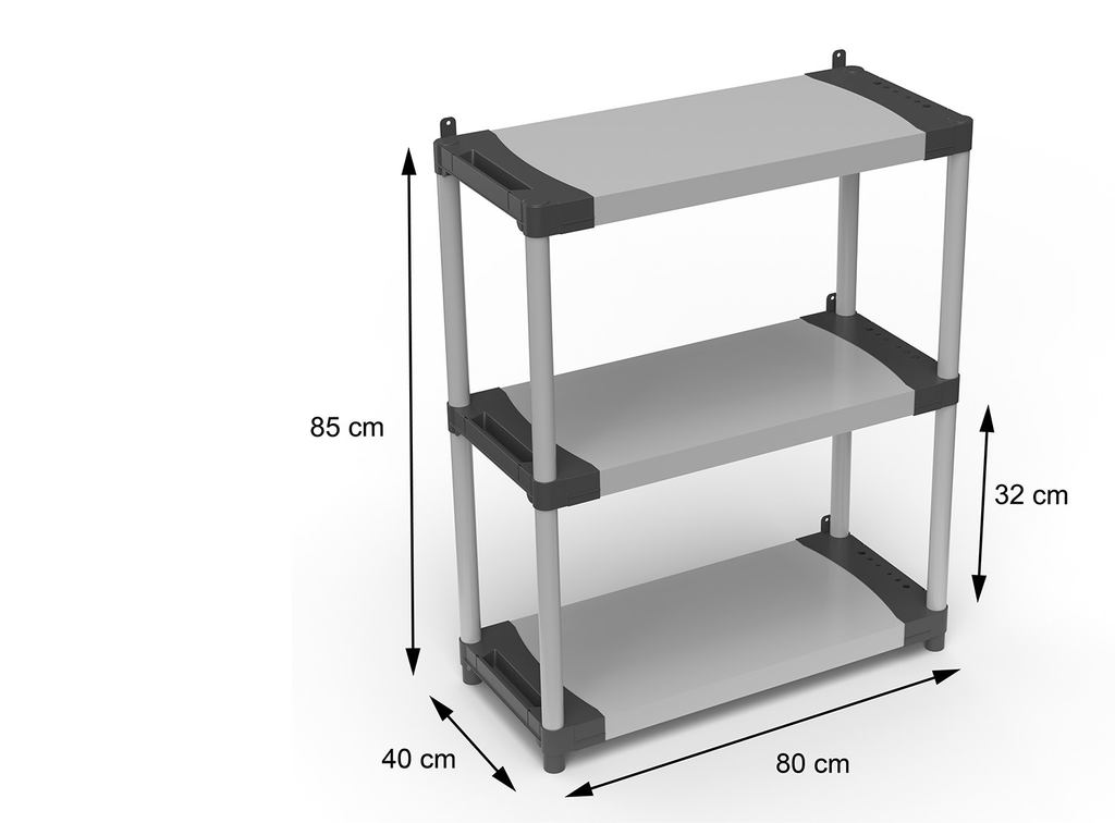 Lo scaffale a 3 ripiani, di dimensioni 80L x 40P x 85H cm, è la soluzione ideale per organizzare e ottimizzare lo spazio di ambienti interni o esterni. I ripiani ed i montanti sono in resina di PVC, le estremità dei ripiani sono invece in resina di PP; tutti i materiali usati per la realizzazione di questo prodotto sono di seconda vita certificati. Stabile e resistente, è adatto all’utilizzo sia in ambienti interni che esterni ed ogni ripiano è in grado di sostenere fino a 80 kg di peso. Il montaggio, semplice e veloce, non prevede l’utilizzo di viti e attrezzi (ad esclusione del sistema di fissaggio al muro) ed è guidato da istruzioni illustrate. Lo scaffale fa parte della serie Modular System, in quanto è predisposto ad essere unito in serie ad altri articoli della linea Storage del marchio Mongardi.