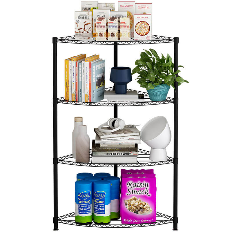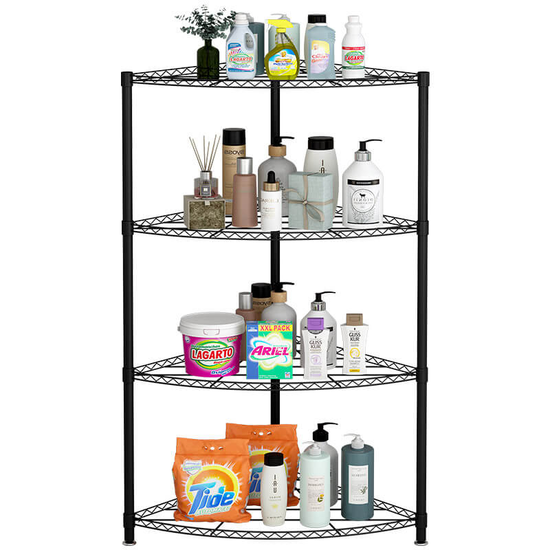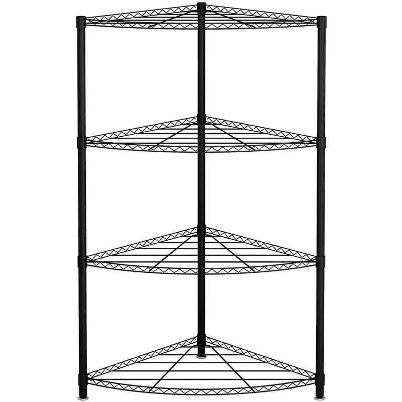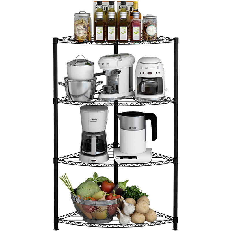 Scaffale a 4 piani con telaio e piani in filo metallico colore nero. Ideale per la cucina o il bagno, può essere utilizzato in tutti gli ambienti della casa, per risolvere l'arredo di angoli con stile e praticità.