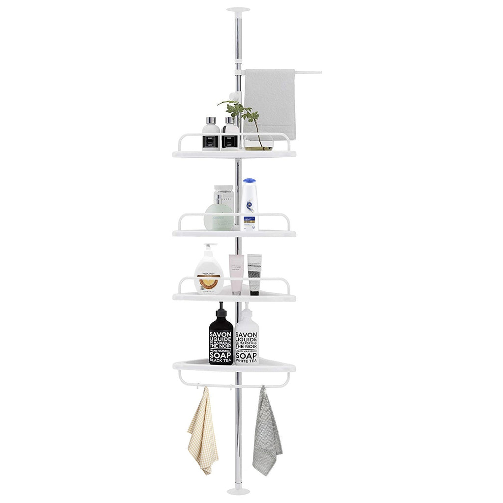 Scaffale telescopico angolare perfetto per organizzare cosmetici e detergenti all'interno del tuo bagno adattandosi perfettamente alle dimensioni del soffitto di casa tua. Il tubo telescopico in metallo estensibile fino a 260 cm ti permetterà di collocarlo ovunque desideri regolando le sue dimensioni in maniera molto semplice. Potrai usufruire di ben 4 scaffali, un appendi asciugamani e 3 gancetti che potrai posizionare a tuo piacimento. Non avrai bisogno di effettuare fori sulle pareti o le mattonelle del bagno, semplicemente appoggiandolo potrai eliminare tutti gli incombri presenti in bagno e organizzare tutti i cosmetici in maniera ordinata e pulita.