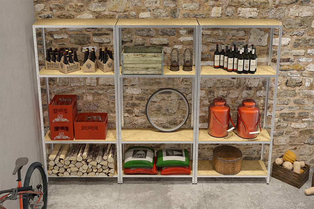 Scaffale in metallo con 4 ripiani in legno truciolato, ogni ripiano supporta 175 kg.