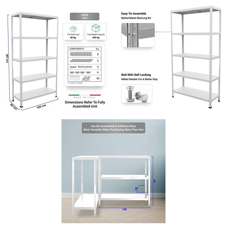 Scaffale in Metallo 5 Ripiani 100x40x187 cm Ettore Bianco