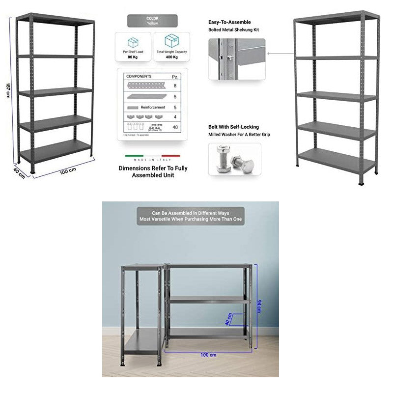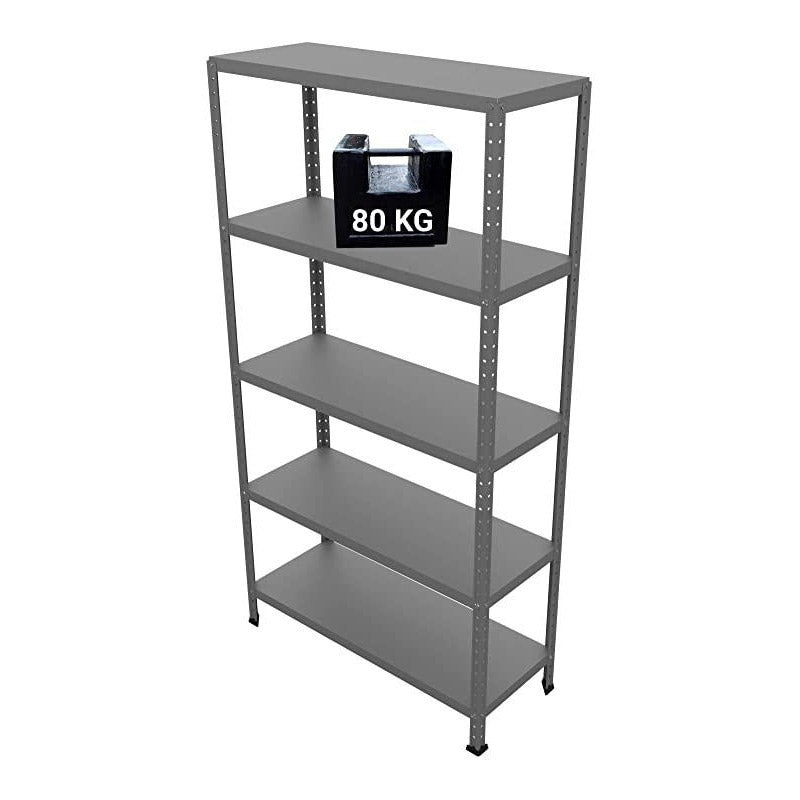Scaffale in metallo con 5 ripiani, ogni ripiano supporta 80 kg.
