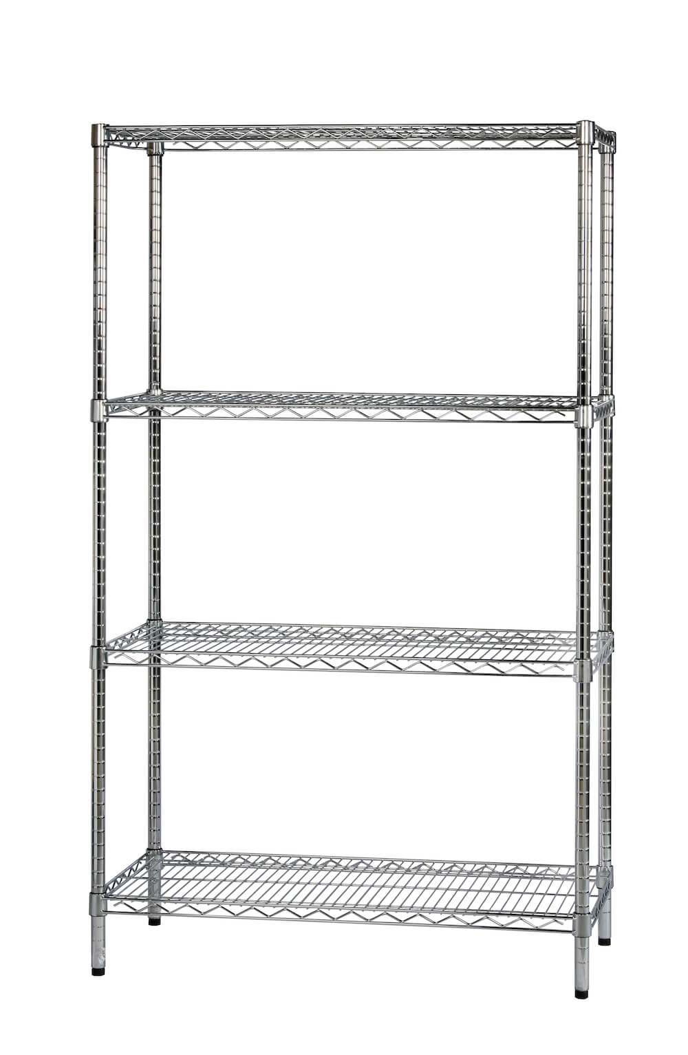 Scaffale in finitura cromo confezionati in robusto colour box dal gradevole aspetto per una accattivante esposizione. Dotato di 4 Ripiani di portata max 100 Kg ciascuno.