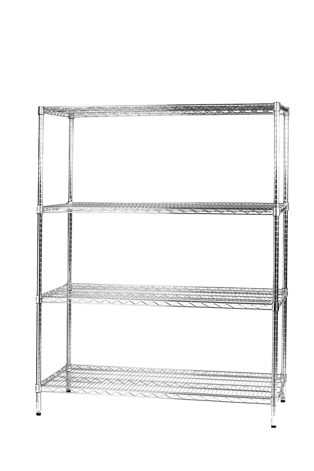 Scaffale in finitura cromo confezionati in robusto colour box dal gradevole aspetto per una accattivante esposizione. Dotato di 4 Ripiani di portata max 100 Kg ciascuno.