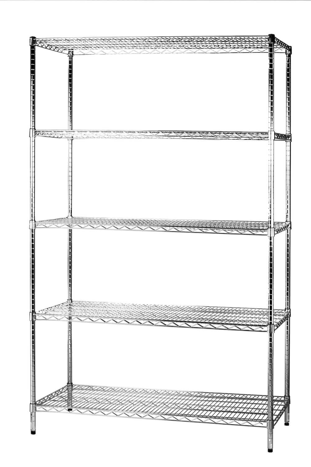 Scaffale in finitura cromo confezionati in robusto colour box dal gradevole aspetto per una accattivante esposizione. Dotato di 5 Ripiani di portata max 100 Kg ciascuno.