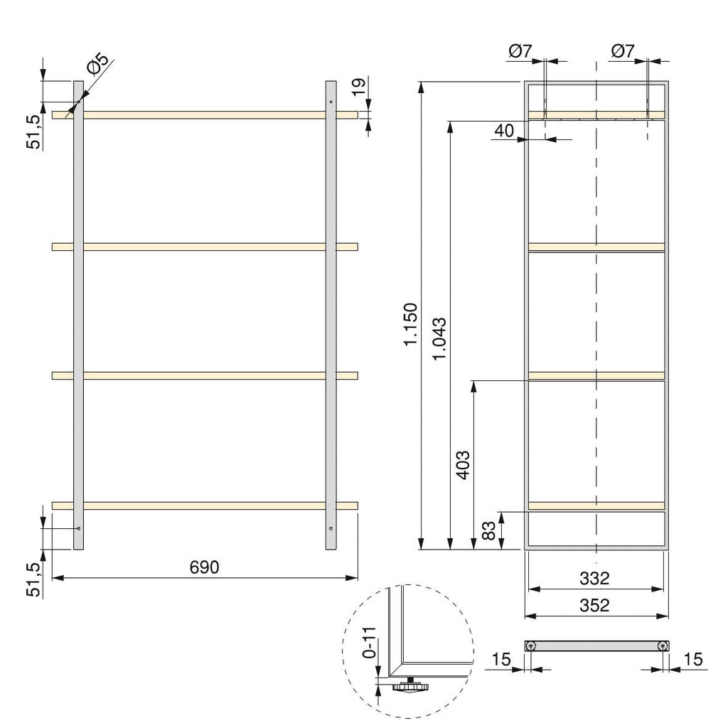 - Ripiani con una lunghezza di 690 mm e 19 mm di spessore.