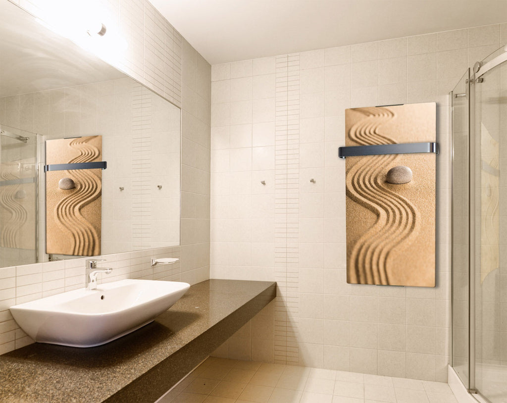 Scaldasalviette con decoro Sabbia. Barra amovibile e termostato regolabile e di grandi dimensioni 90x6x46, adatto per il montaggio in bagno con protezione IP24 contro gli spruzzi d'acqua da tutte le direzioni. Adatto per superfici di circa 10 metri quadrati.