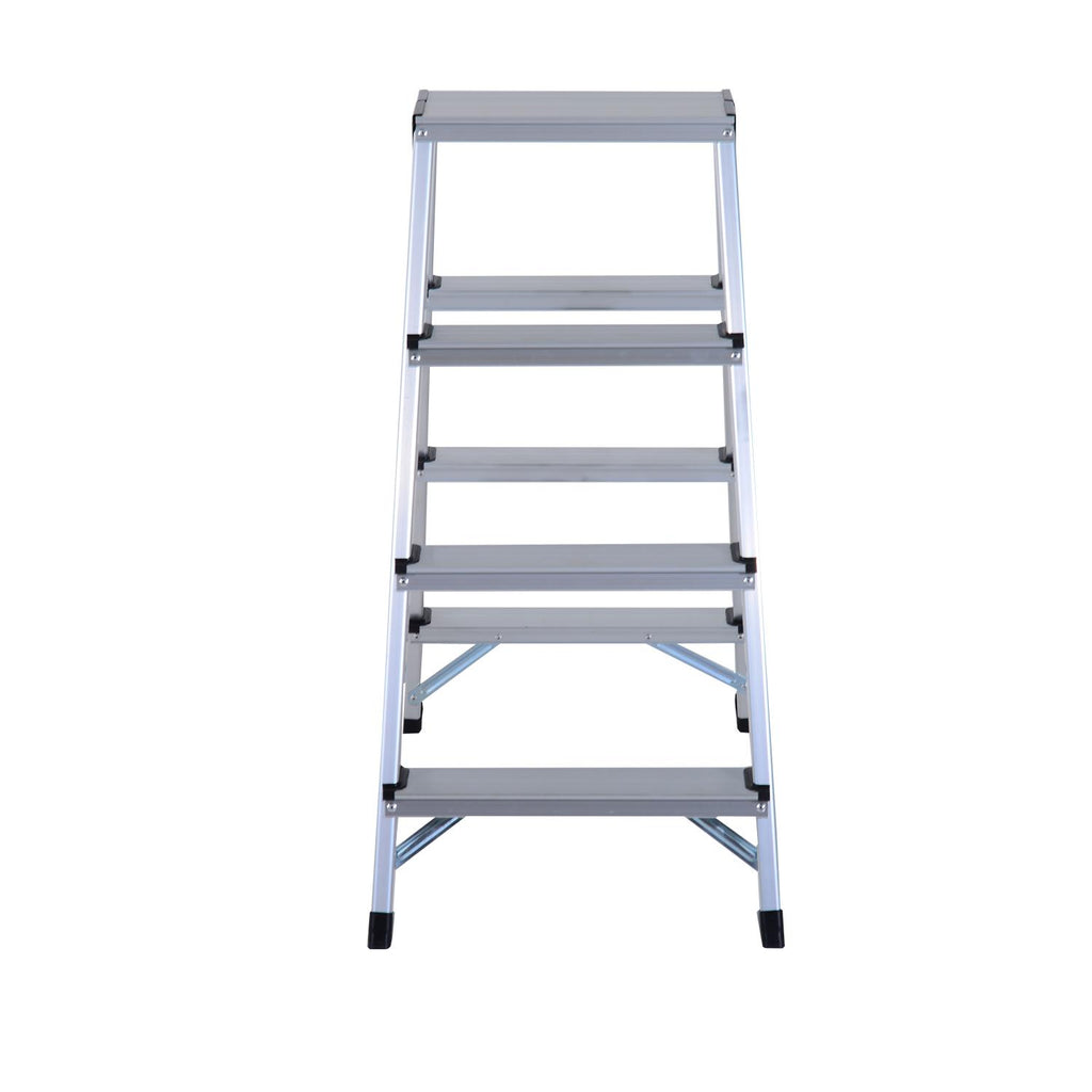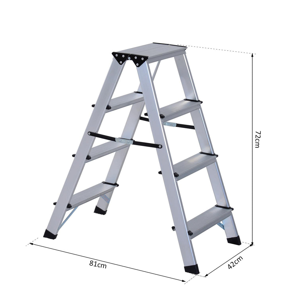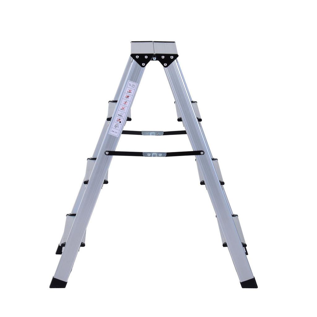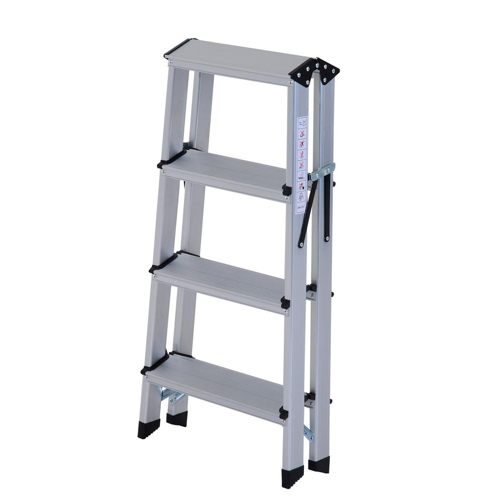 Questo doppia scaletta offre grande aiuto per i lavori di piccola manutenzione in casa o all'esterno. Robusta e stabile, realizzazione in lega d'alluminio di elevata qualità . Può sostenere un carico massimo di 150kg. I 4 piedini antiscivolo garantiscono la massima stabilità e sicurezza. Molto leggera e conveniente grazie alla struttura pieghevole.