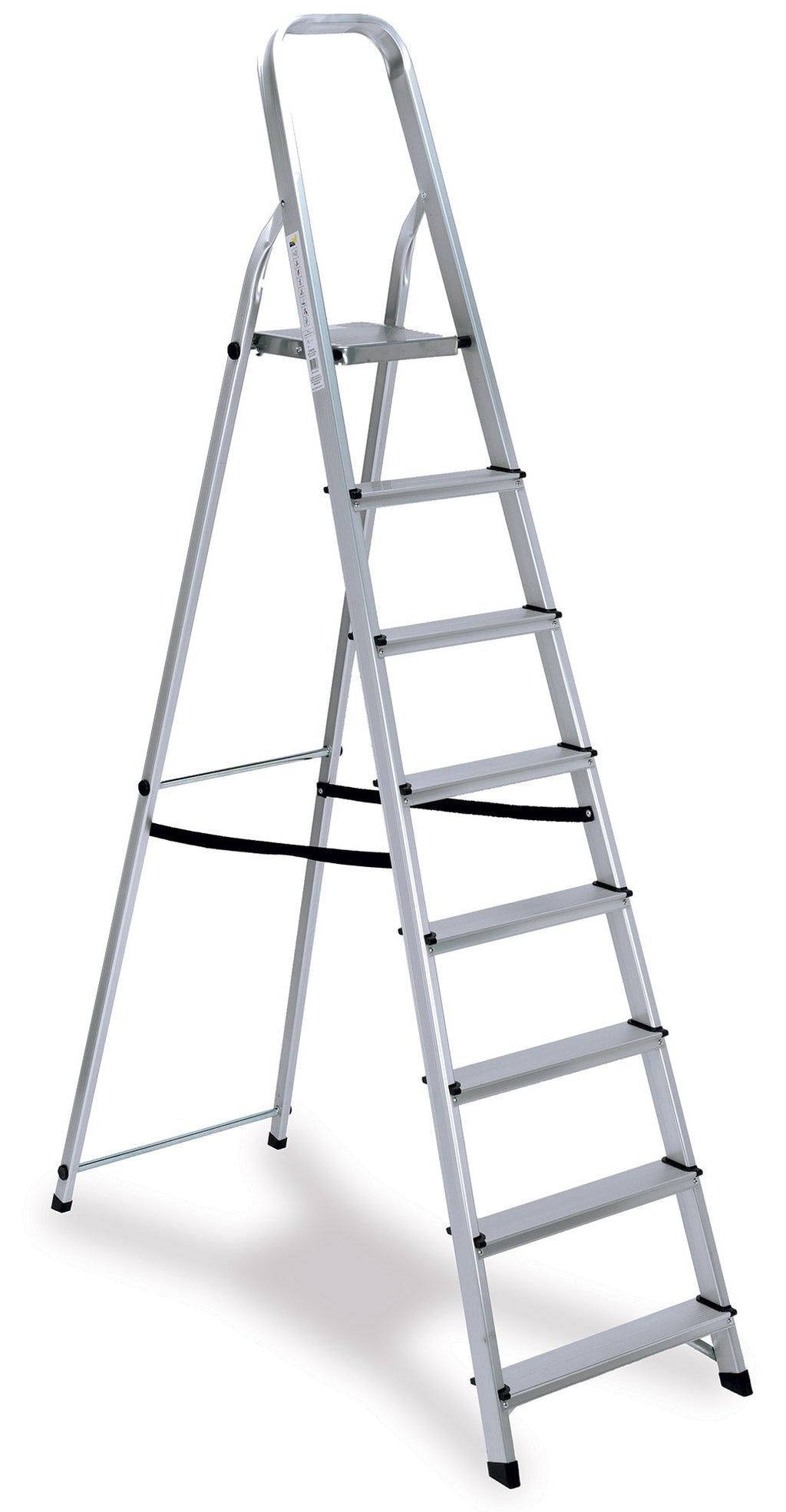Scala in alluminio con otto gradini antisdrucciolo, puntali antiscivolo, fettuccia antidivaricamento e gancio di sicurezza. Consigliata per uso domestico e bricolage. Portata massima 150 kg.