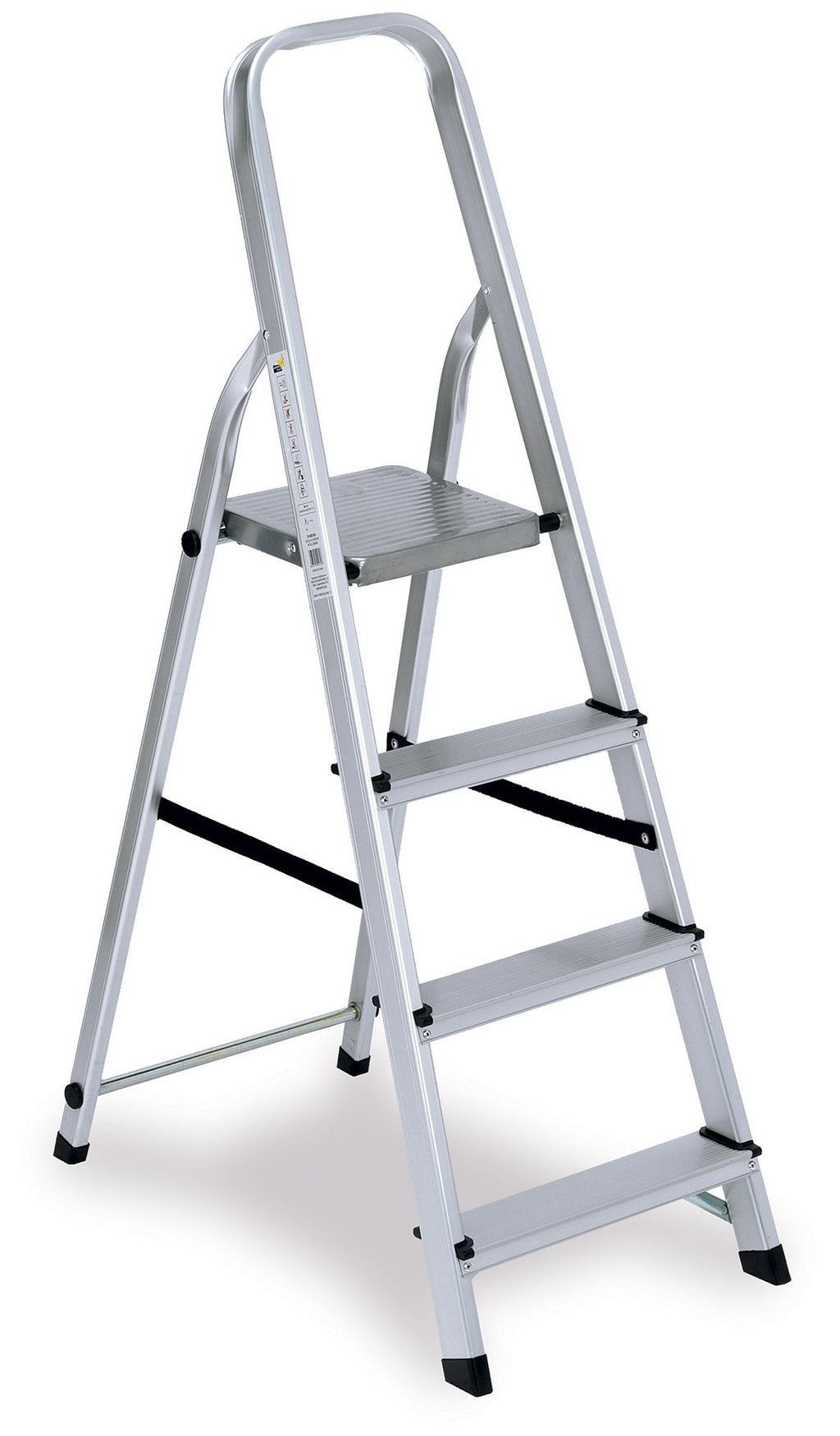 Scala in alluminio con quattro gradini antisdrucciolo, puntali antiscivolo, fettuccia antidivaricamento e gancio di sicurezza. Consigliata per uso domestico e bricolage. Portata massima 150 kg.