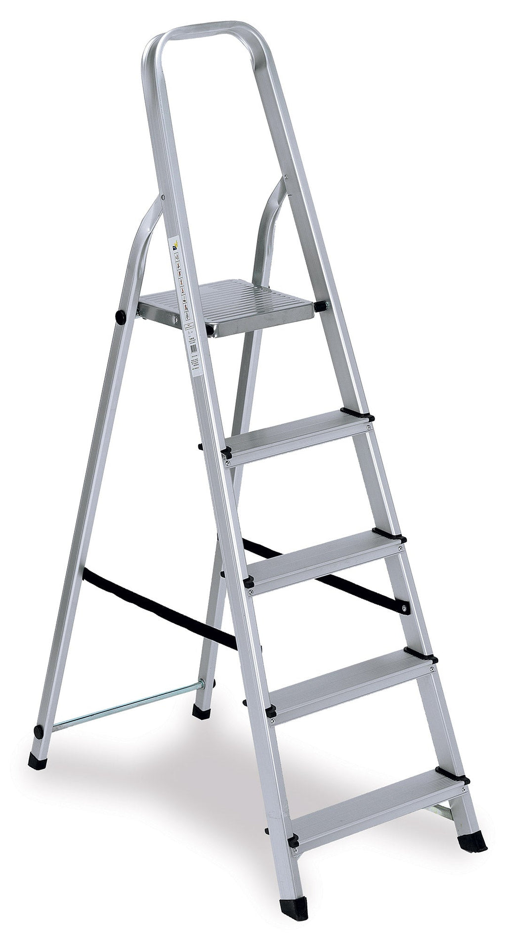 Scala in alluminio con cinque gradini antisdrucciolo, puntali antiscivolo, fettuccia antidivaricamento e gancio di sicurezza. Consigliata per uso domestico e bricolage. Portata massima 150 kg.