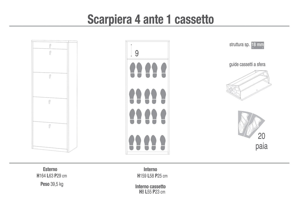 Scarpiera 4 Ante 1 Cassetto 63x164x29 cm Cemento