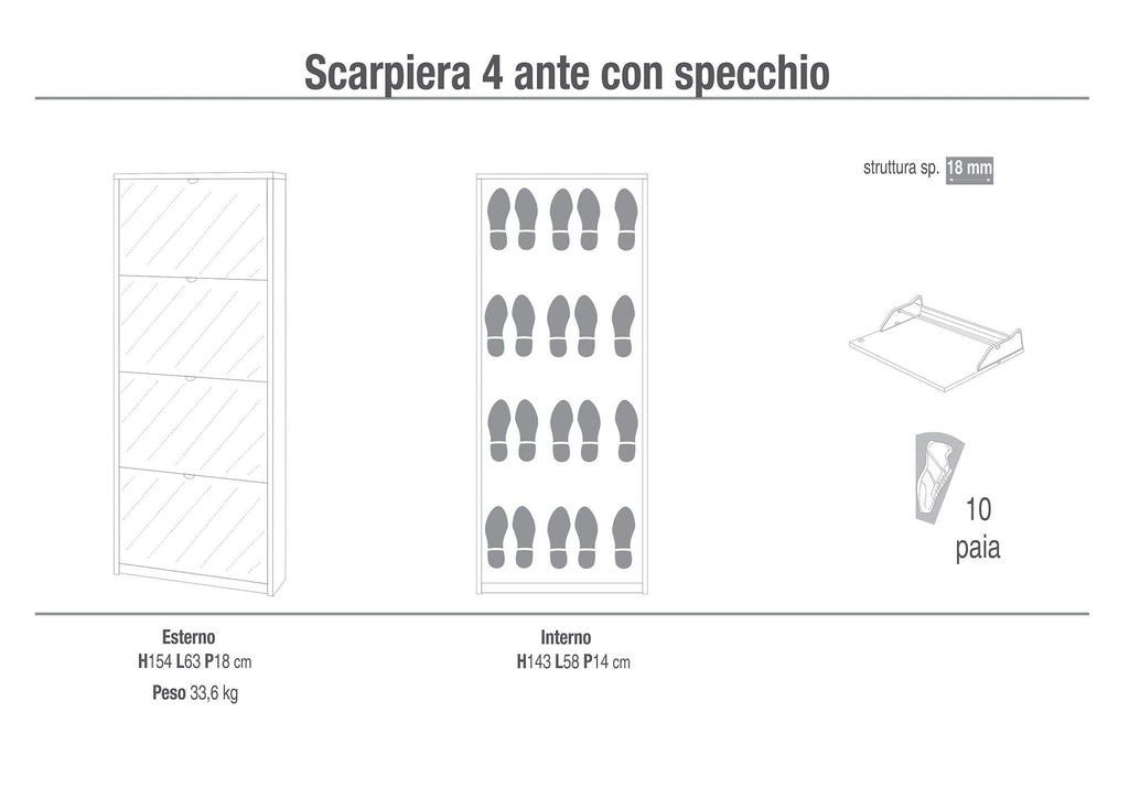 Scarpiera 4 Ante con Specchio 63x154x18 cm Bianco Fiammato