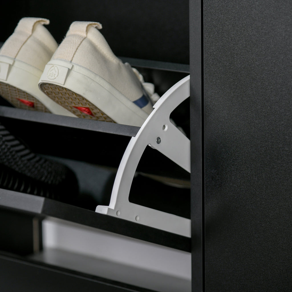 - 3 scomparti con ante a ribalta, ciascuno con 2 ripiani, ogni ripiano può contenere fino a 3 paia di scarpe.