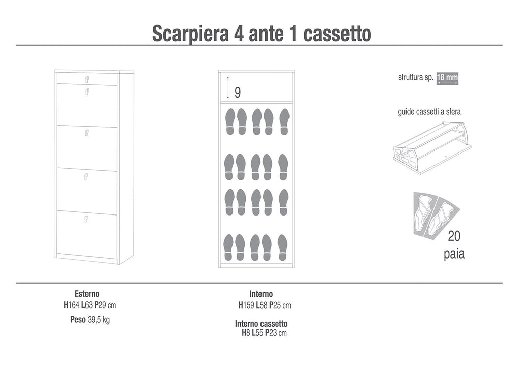 Scarpiera Salvaspazio 4 Ante 1 Cassetto 20 Paia 63x164x29 cm Noce Stelvio
