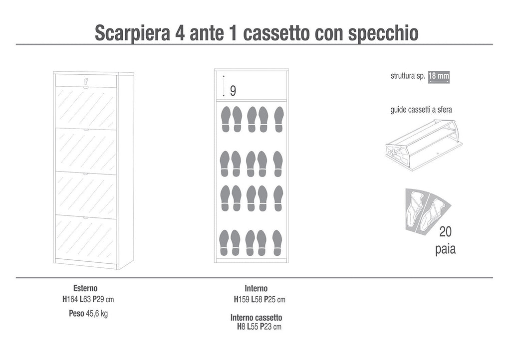 Scarpiera Salvaspazio 4 Ante con Specchio 1 Cassetto 20 Paia 63x164x29 cm Noce Stelvio