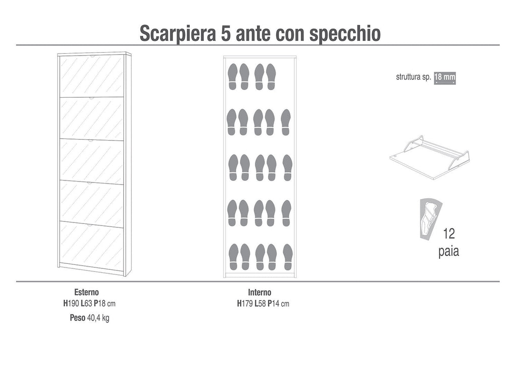 Scarpiera Salvaspazio 5 Ante con Specchio 12 Paia 63x190x18 cm Noce Stelvio