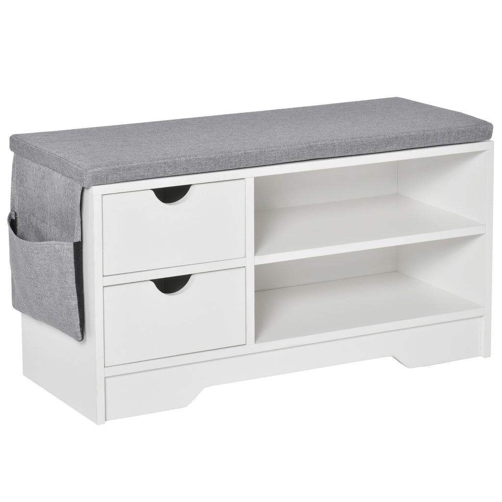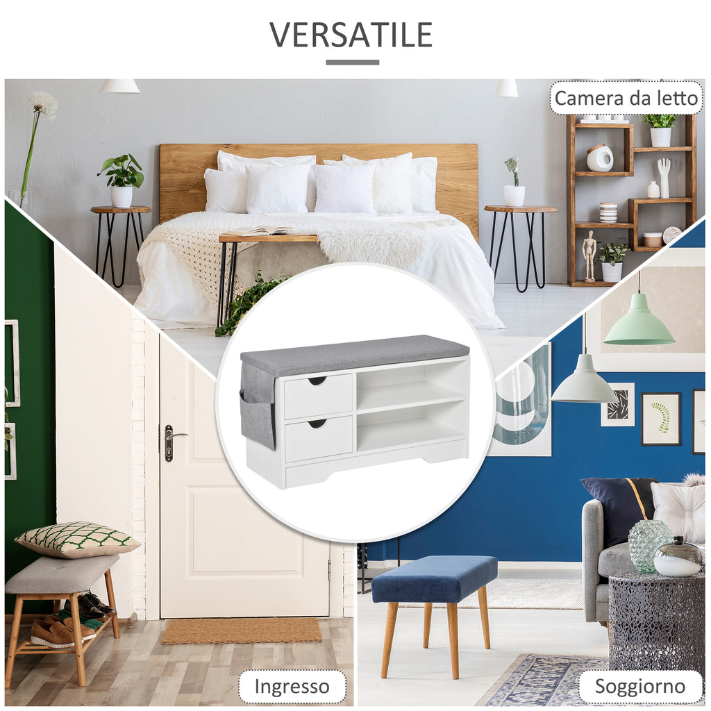 - SPAZIOSA: Questa panca scarpiera ha 2 ripiani in cui puoi sistemare fino a 4 paia di calzature. In più, ha 2 cassetti e 1 tasca laterale in cui riporre chiavi, calzini o riviste.