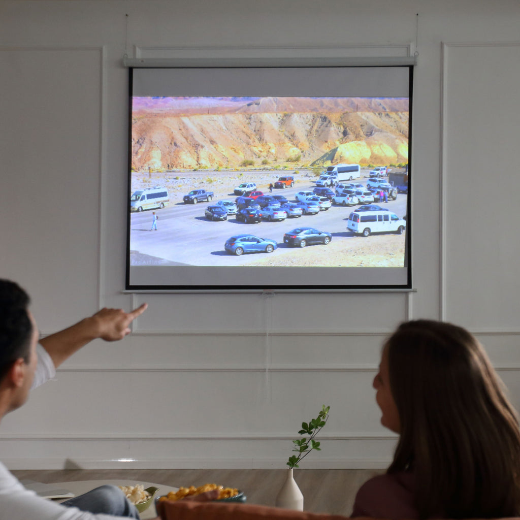 Questo telo proiettore da 100 pollici è adatto a tutti i tipi di proiettore sul mercato. Telo proiettore di alta qualità, i quattro lati con bordi neri migliorano il contrasto dell'immagine. Resistente involucro metallico per installazione a parete e soffitto, accessori inclusi. Altezza regolabile tramite il sistema di bloccaggio. Schermo facile da pulire con un panno umido.