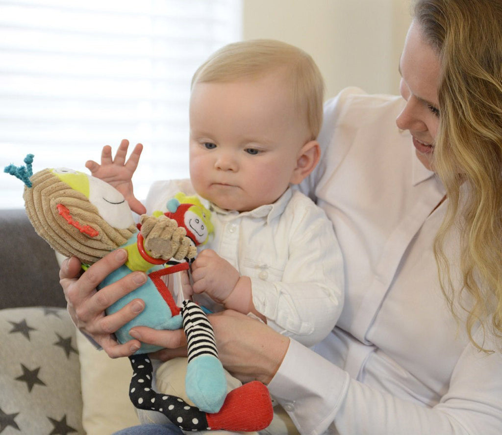 La prima esperienza di un bambino nella cura e nell'accudimento genitoriale. La scimmia adulta porta nel suo marsupio un grazioso cucciolo staccabile per un divertimento senza fine. Il bambino può fare esperienza con l'accudimento e il racconto di storie. Al divertimento si aggiungono uno specchio sulla pancia, un suono quando schiacciata, un sonaglio e un massaggiagengive.
